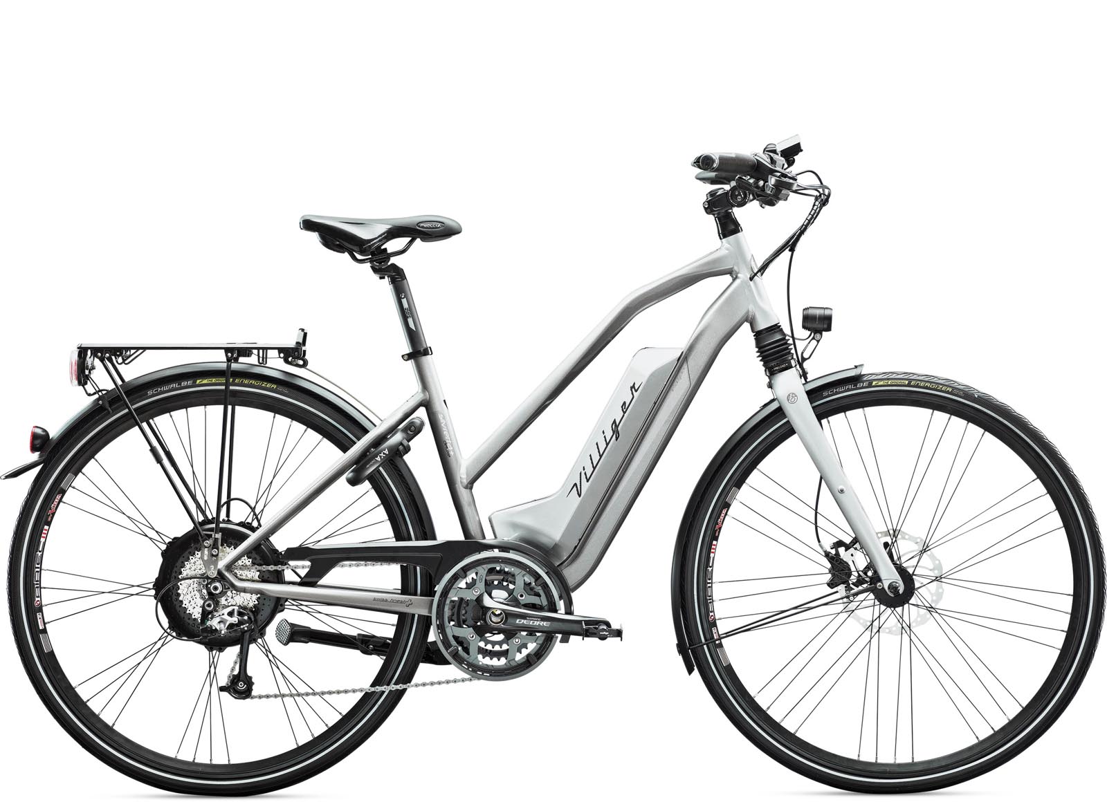 Beim Modell Silvretta Deluxe+ handelt es sich um das mittelpreisige Modell aus der „Ride+ Sport“-Reihe von Villiger. Ein einzigartiges, einzig für diese Modellreihe entwickeltes Akku-Rahmenkonzept, das optisch attraktiv wirkt, kennzeichnet diese E-Bikemodelle für Damen und Herren. Der sportliche Trekkingrahmen und der flache Lenker unterstreichen die Sportlichkeit dieses Elektrofahrrades. Das „Ride+“-Modell bietet auch einen eigenen „Ride+“-Motor mit 250 Watt, der sich in der Hinterradnabe befindet und den Fahrer bzw. die Fahrerin bis 25 km/h unterstützt, und den „Ride+“-Akku mit beachtlichen 420 Wattstunden (Wh) „Ausdauer“. Die Sportlichkeit des Modell drückt sich natürlich nicht alleine durch seinen längeren Atem aus (420 Wh), sondern auch durch das übrige Setting. Allen voran muss die 27-Gang-Schaltung von Shimano genannt werden, die sich bei anspruchsvollerem Gelände bewährt. Damit das Gefährt bei Tempo problemlos zum Stehen kommt, hat man hochwertige hydraulische Scheibenbremsen der Qualitätsmarke Magura montiert. Schutzbleche, Ständer, Gepäckträger und E-Bike-Beleuchtung sorgen ihrerseits für die Alltagstauglichkeit des E-Bikes. Wer ein E-Bike sucht, das einen speziellen Look aufweist und mit der sportlichen Note versehen ist, sollte dieses Modell einmal Probe fahren.